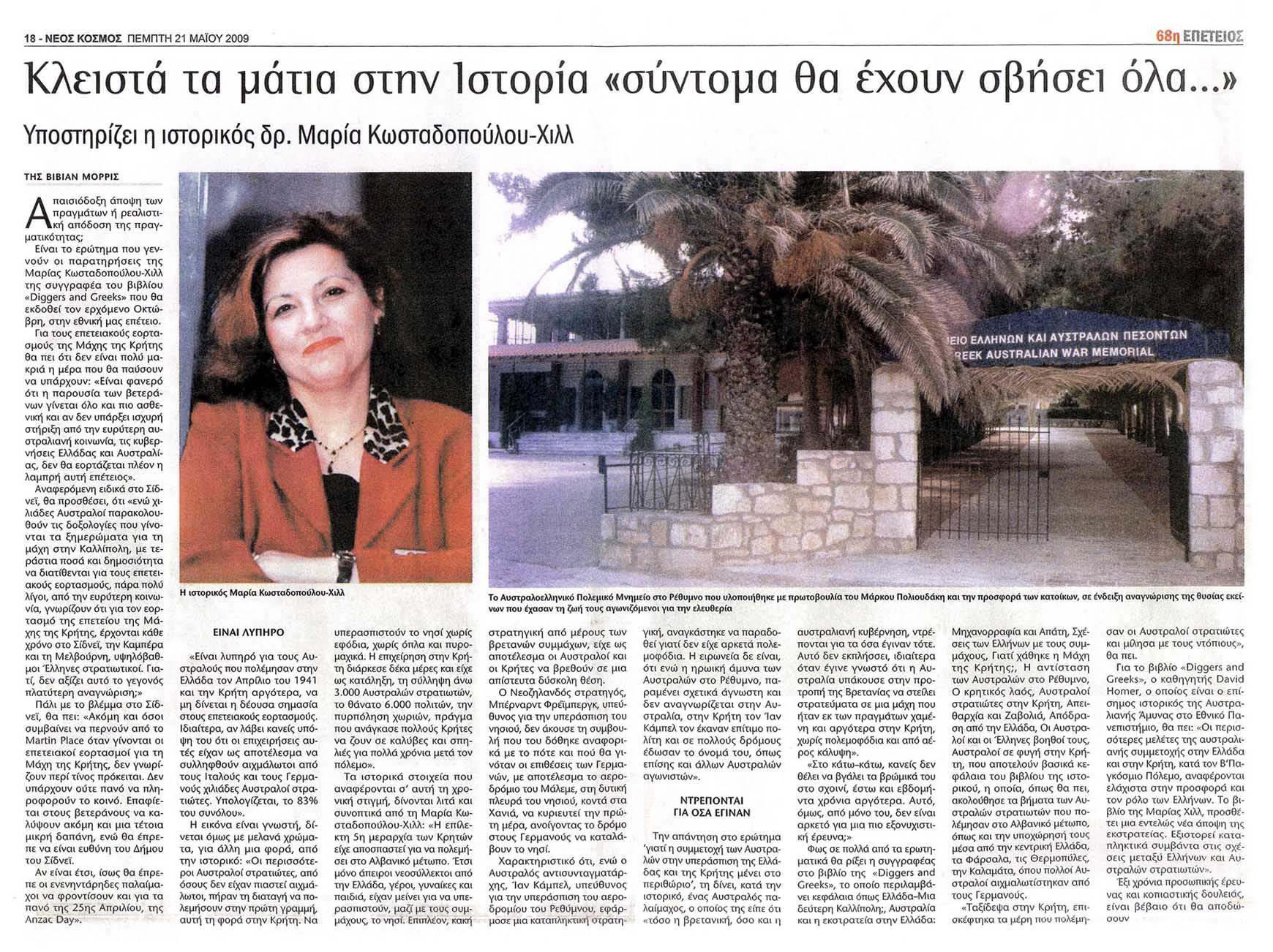 Newspaper Articles "A Campaign Ignored", Neos Kosmos, English language edition, 18 May 2009 p.11. Download PDF>> "'Close your eyes to History and soon everything will have disappear ...' declares Dr Maria Costadopoulos-Hill", Neos Kosmos, Greek language edition, 21 May 2009 p.18, reporter Vivian Morris. Download PDF>>